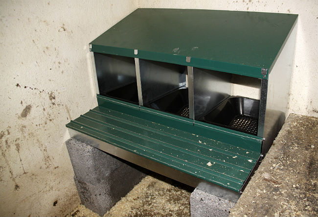 Redet som vi beställde över nätet kom inom några dagar. Regnet stod som spön i backen när DHL rullade in med en väldigt vältejpad kartong innehållande ett gäng vassa plåtbitar. Lådan blev placerad i ladan ett par veckor, men nu har vi fått tummen ur och monterat ihop det hela. Peter köpte några lecablock att ställa det på, istället för att skruva fast det i väggen och riskera att putsen skulle få skador. Redet är som sagt i plåt och kanske inte det mest charmiga man sett, men det är säkert mot kvalster och äggen rinner nu ner i en ränna istället för att ligga kvar för ettriga hönsnäbbar. Så nu lutar vi oss tillbaka på det området igen och hoppas att hönsen accepterar sin nya inredning.