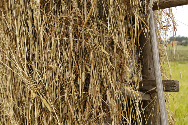 Peter tog in den lilla hässjan vi haft stående på åkern i säkert en och en halv månads tid nu. Även om vi vet att det tål att regnas en hel del på dem, så hade vi helt givit upp på denna. Det regnade verkligen varje dag då när vi precis lagt upp den, så vi prioriterade bara frankt bort nedmonterandet, i fullständig förvissning om att det var helt kört ändå. Men så tog Peter som sagt ner den i morse, helt inställd på att få slänga alltihopa. Men, se där! Under de övre lagren fanns det helt godtagbart hö att förvara till vintern. Vi snackar kanske inte världsklass, men ändå helt okej. Hässjor alltså! Våra rekommendationer når inga gränser.